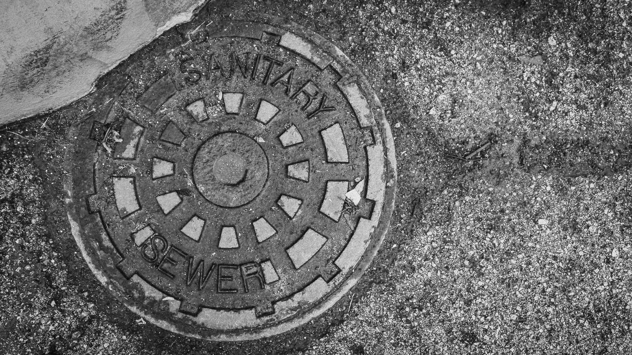 • A circular metal street drain cover with the words 'SANTA RY' and 'SEWER' embossed on its surface, surrounded by rough asphalt pavement.
